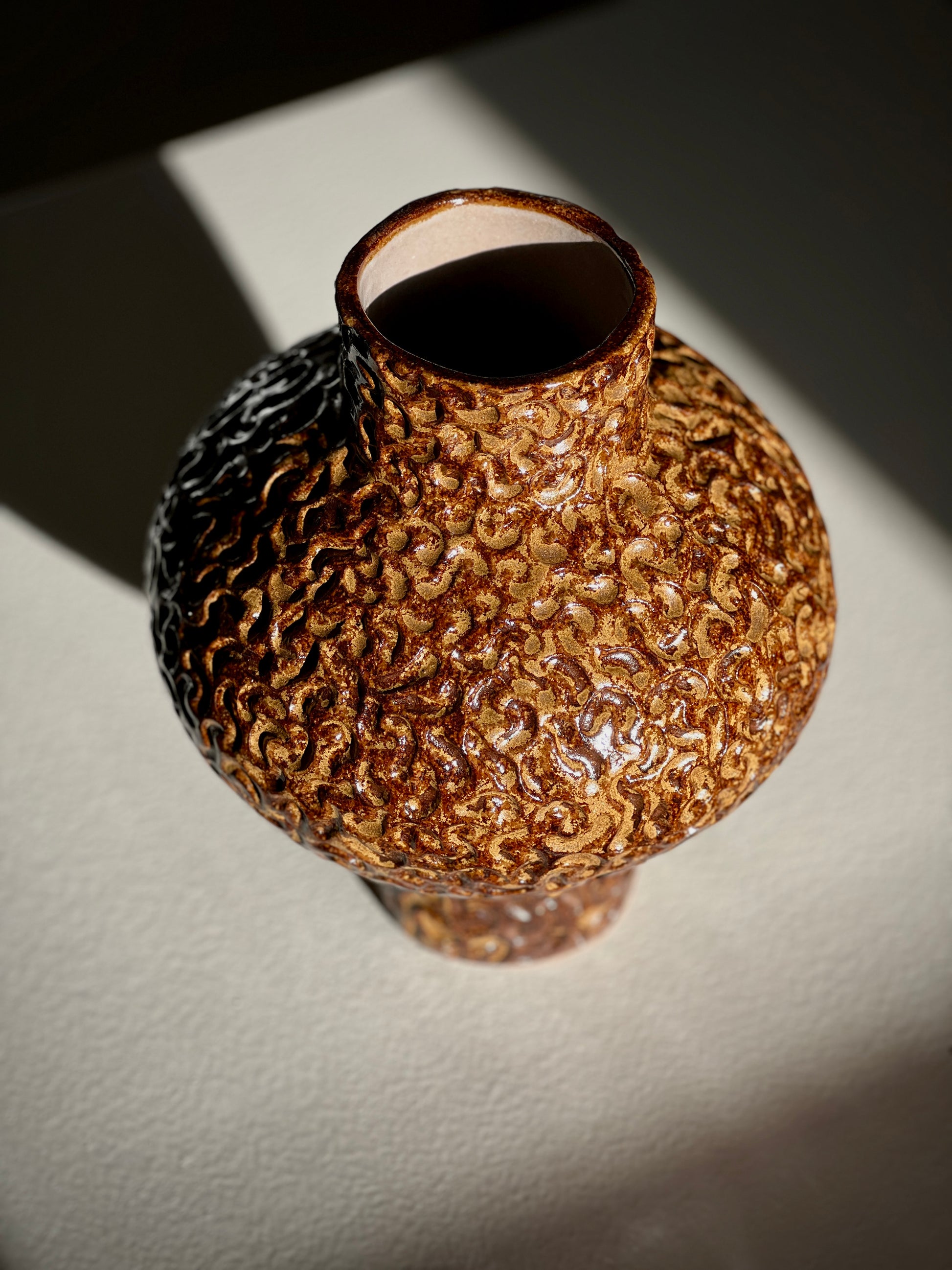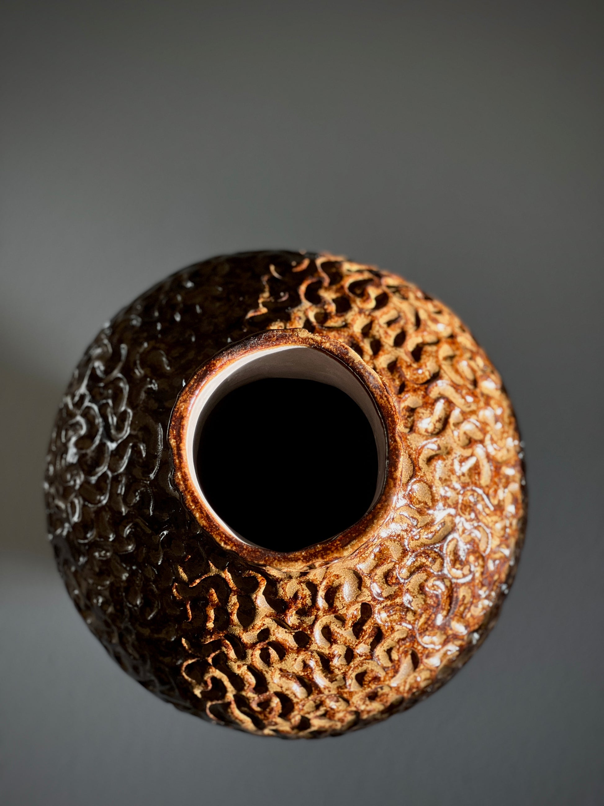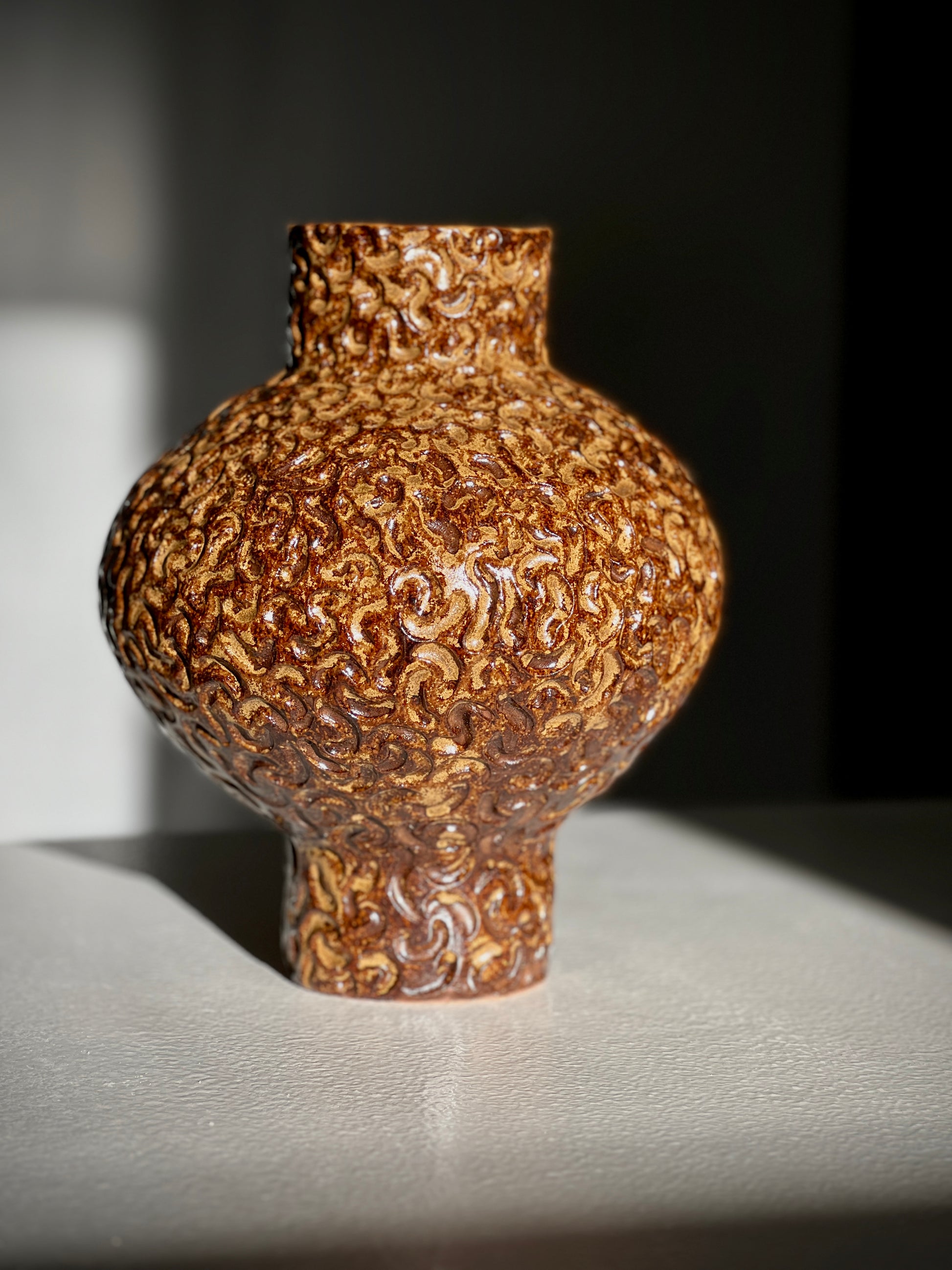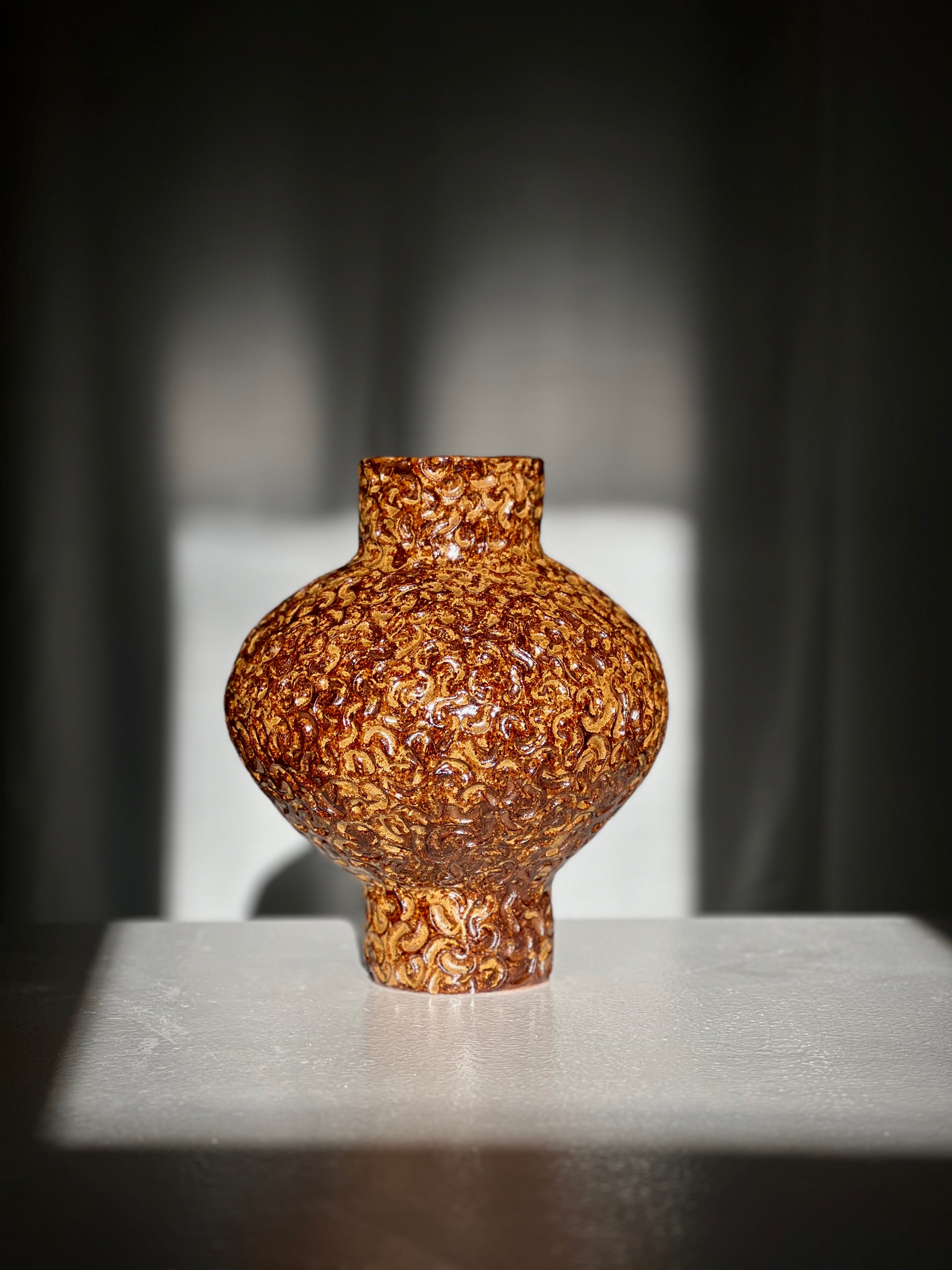 Quiet Season is a vase with a grounded, contemplative presence. Its rounded silhouette and raised textured surface create a feeling of calm movement, like earth settling after rain. The warm brown glaze shifts in tone depending on the light, revealing layers of amber and deep umber that flow through the carved pattern. This piece carries the mood of a slower moment, a pause you can hold. A sculptural object for interiors that appreciate depth, tactility, and quiet beauty.