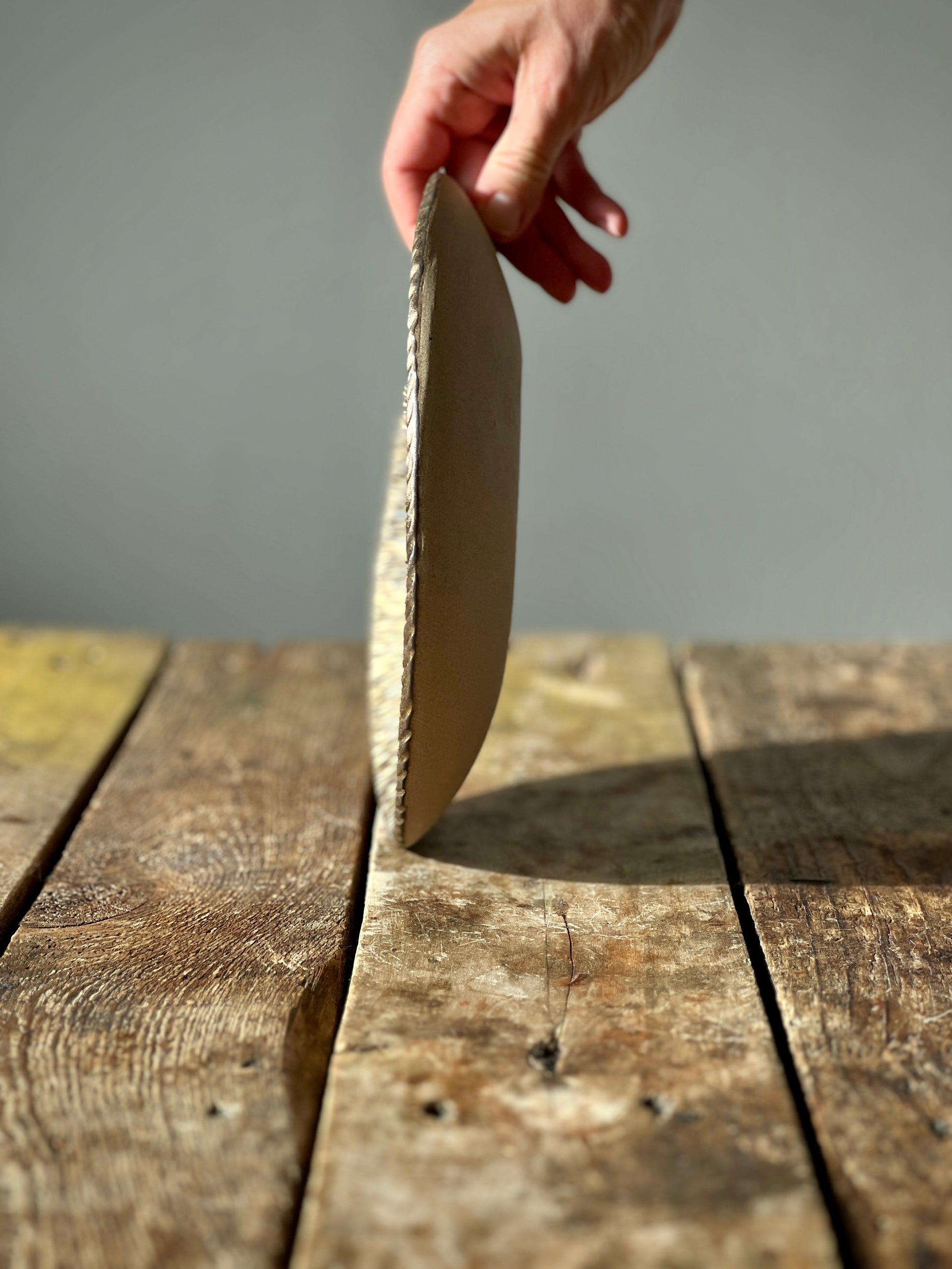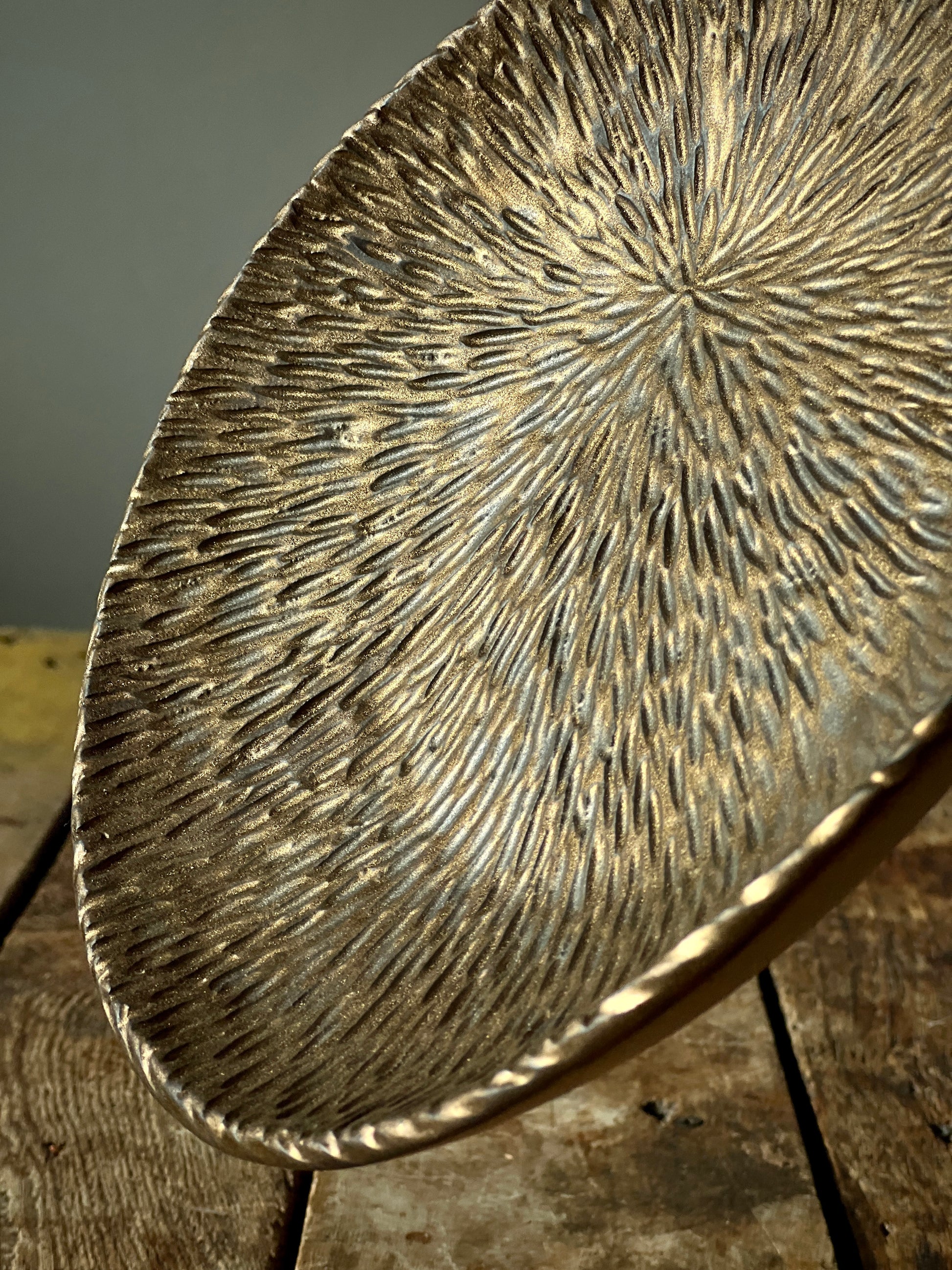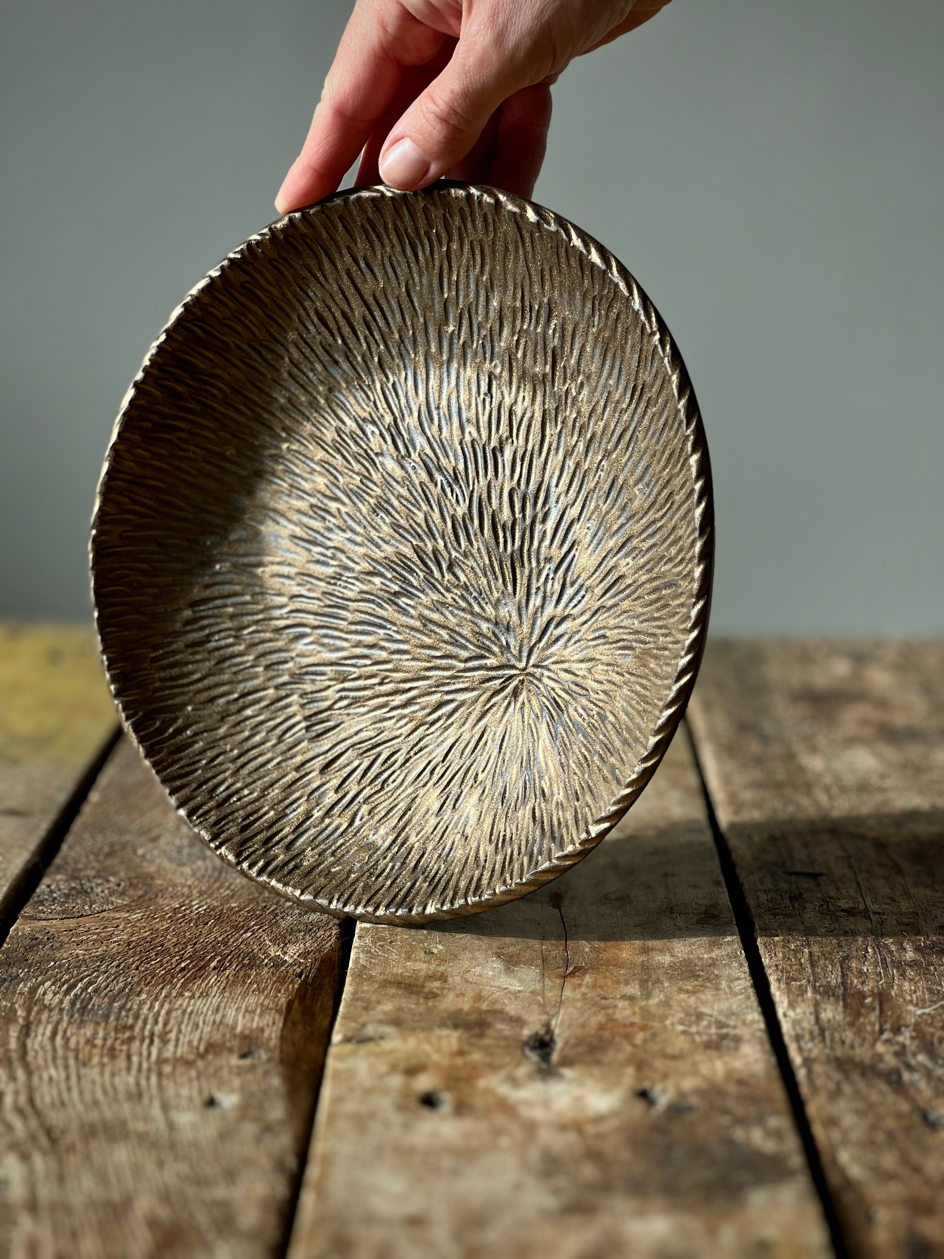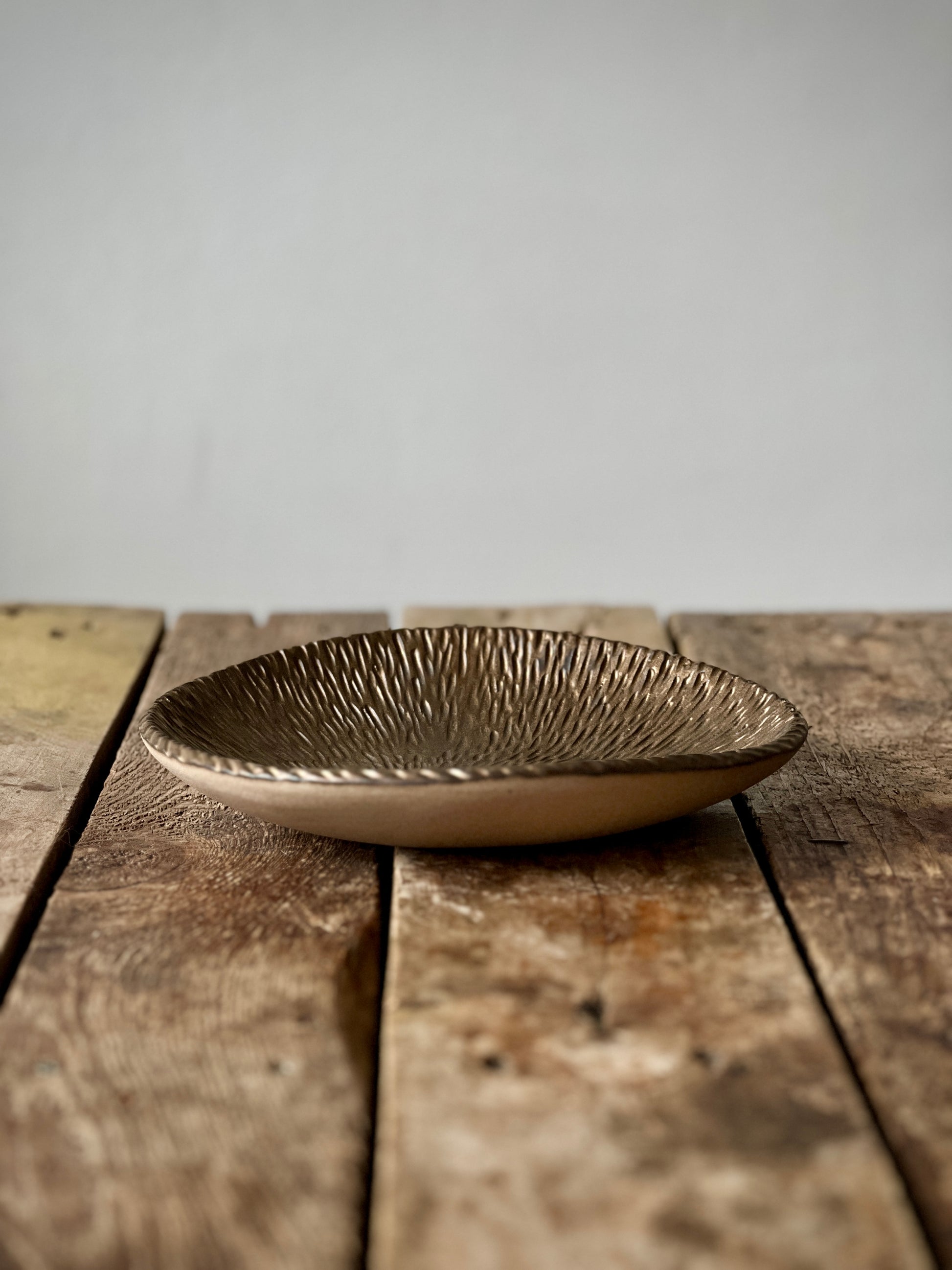 Introduce warmth and elegance to your table with the Textura Glow Bowl, a stunning handcrafted piece made from rich beige stoneware clay. Each bowl is meticulously handbuilt, highlighting the artisan's craftsmanship. The unglazed exterior features a natural, earthy finish that complements the bowl's organic aesthetic. Inside, the beautifully carved design is enhanced by a glossy glaze with a hint of golden shimmer, creating a captivating contrast that reflects light beautifully.